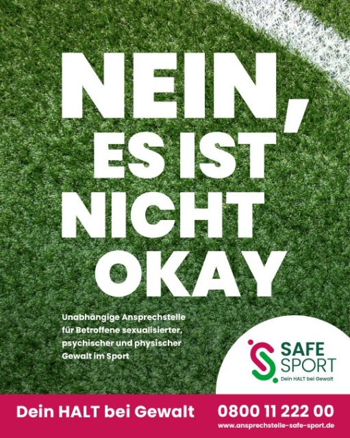 Wir haben im Vereinsrat einstimmig beschlossen, „NEIN, ES IST NICHT OKAY“ von Safe Sport e.V. auch bei uns im Verein öffentlich zu machen. Dazu werden wir im Eingangsbereich ein Plakat aufhängen mit einer Hilfe-Hotline anbringen. Des Weiteren werden wir auf unserer Homepage dauerhaft einen Link zu Safe Sport e.V. etablieren. Wir möchten an dieser Stelle ausdrücklich darauf hinweisen, dass es derzeit keinen aktuellen Anlass dazu im Verein gibt.