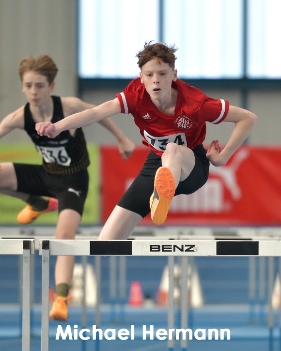 Absoluter Protagonist der Meisterhaften war Michael Hermann (M14), der sich gleich zwei Titel sicherte. Über die 60m Hürden siegte er mit einer neuen persönlichen Bestzeit von 9,48 Sek., und auch im Hochsprung war er mit übersprungenen 1,55 m nicht zu schlagen. Abgerundet wurde seine starke Bilanz durch zwei vierte Plätze im 60m-Sprint und im Weitsprung.